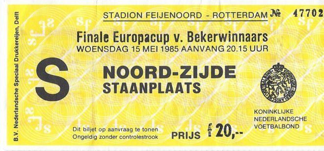 De UEFA kent de finale van de Europa Cup voor bekerwinnaars in 1985 toe aan Rotterdam. Het is wellicht onnodig om te vermelden dat ik die avond in De Kuip aanwezig ben. De finaleplaats van Everton verwondert minder dan die van Rapid Wien. De Engelsen schakelen onderweg onder meer Fortuna Sittard (kwartfinale) en Bayern München (halve finale) uit. De Oostenrijkers rekenen af met achtereenvolgens Besiktas, Celtic, Dynamo Dresden en Dynamo Moskou. In de volle Kuip heeft Rapid weinig in te brengen tegen de oppermachtige Toffees. Andy Gray, Trevor Steven en Kevin Sheedy treffen doel namens Everton, de oude Krankl scoort tegen.