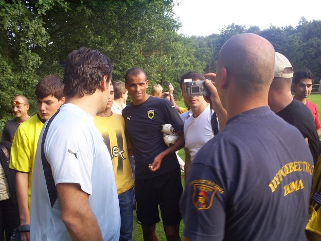 Iedereen wil wat van de dan al 35-jarige Vítor Borba Ferreira. De tientallen aanwezige Griekse fans raken nóg opgewondener dan ze toch al zijn. Ze willen hun nieuwe held aanraken, een handtekening of met de Braziliaanse superster op de foto. Of gewoon alles tegelijk. De vedette, wel wat gewend natuurlijk, ondergaat alle heisa geduldig en geroutineerd. Terwijl zijn nieuwe medespelers na afloop al lang en breed weer in de kleedkamer zitten, staat Rivaldo nog uitgebreid te poseren met zijn bewonderaars.