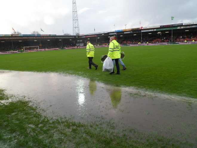 Afgelaste wedstrijden als gevolg van sneeuw, ijs of dichte mist zijn me niet vreemd. Een overstroomt veld betekent echter een primeur. Zo bar en boos als het er vier jaar geleden aan toegaat bij de thuiswedstrijd tegen Heracles zie je het maar zelden. Heel extreem.