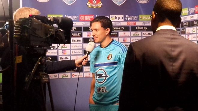 Onder toeziend oog van een medewerker van Feyenoords persafdeling draait de international zoals gebruikelijk niet om de hete brij heen en zegt waar het op staat.