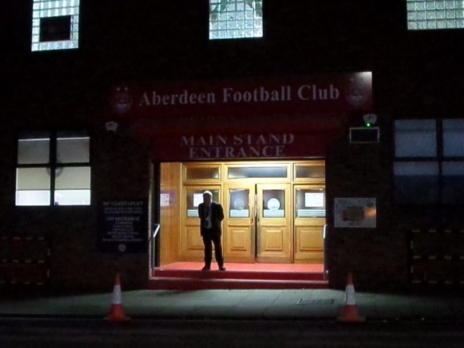 De kick-off staat vastgesteld voor 19.45 uur local time. Ik ben bij nader inzien een beetje te vroeg ter plaatse. Meer dan twee uur voor de aftrap struin ik al rond de nog zo goed als verlaten straten rond Pittodrie. Het NOS-trio Tom Egbers, Jeroen Elshof en Jeroen Grueter is er vroeg bij. Ik maak een praatje met Celtic-fan Grueter, die de haveloze muren van de hoofdtribune met zijn camera vereeuwigt. De modern ages hebben nog geen vat gekregen op Pittodrie. Van buiten heeft het wel wat weg van een fabriek. Even later sta ik ook met de neus vooraan als de Nederlandse spelersbus arriveert. En zo dood ik een beetje de tijd in de aanloop naar de wedstrijd.