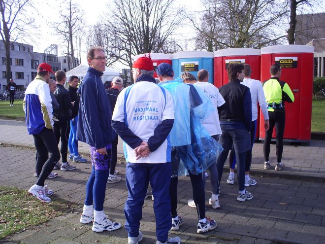Hoe dan ook, het is al dringen geblazen voordat er gelopen wordt. In vier rijen staan deelnemers voor de mobiele pishokjes opgesteld om de druk op de blaas te minderen. Voor velen een laatste plichtpleging alvorens het startschot klinkt.