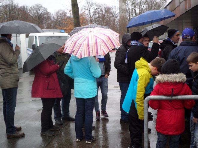 Met mijn paraplu kwam ik in eerste instantie zonder problemen door de toegangscontrole. Niemand van het dienstdoende personeel had er wat op aan te merken. Terwijl ik me toch zeker langs drie of vier gewaardeerde krachten van de firma SDS Security & Service heen moest worstelen om de onoverdekte staantribune te bereiken waar ik een kaartje voor had gekocht.