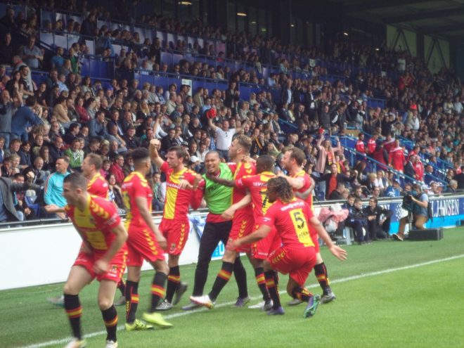 De verlossende treffer van Leon de Kogel valt voor mijn neus. Na de 4-1 overwinning van drie dagen eerder in Deventer breekt die 1-1 feitelijk het verzet van De Graafschap. Go Ahead Eagles houdt wonderwel stand op de kolkende Vijverberg. Dat het vaak met meer geluk dan wijsheid gebeurt, doet weinig ter zake. Who cares? De Deventenaren keren terug in de eredivisie. De Graafschap degradeert naar waar het thuishoort, de Jupiler League.