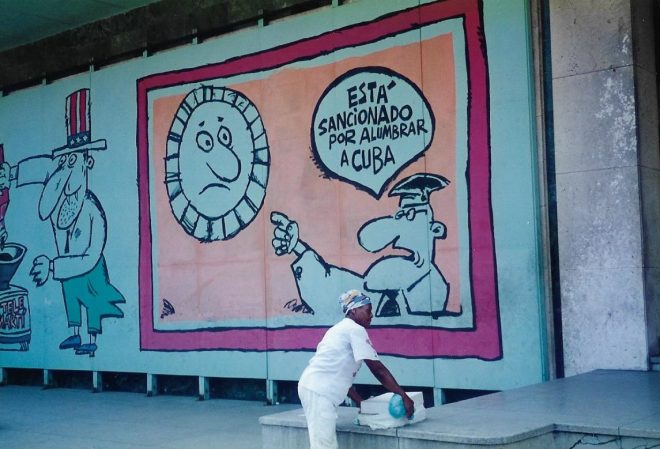 Voor zover er al sprake is van schaarste, wordt op verf voor propagandadoeleinden in elk geval niet bezuinigd. Muurschilderingen op calle 23, in de volksmond beter bekend als ‘la Rampa’, verbeelden dit treffend. Het stukje huisvlijt ter hoogte van Havana’s beroemde kustboulevard de Malecón met de boodschap dat zelfs de zon eerdaags een verbod krijgt om te schijnen in Cuba mag gerust een subtiele verwijzing naar het verfoeide ‘Yankee Imperialisme’ worden genoemd.